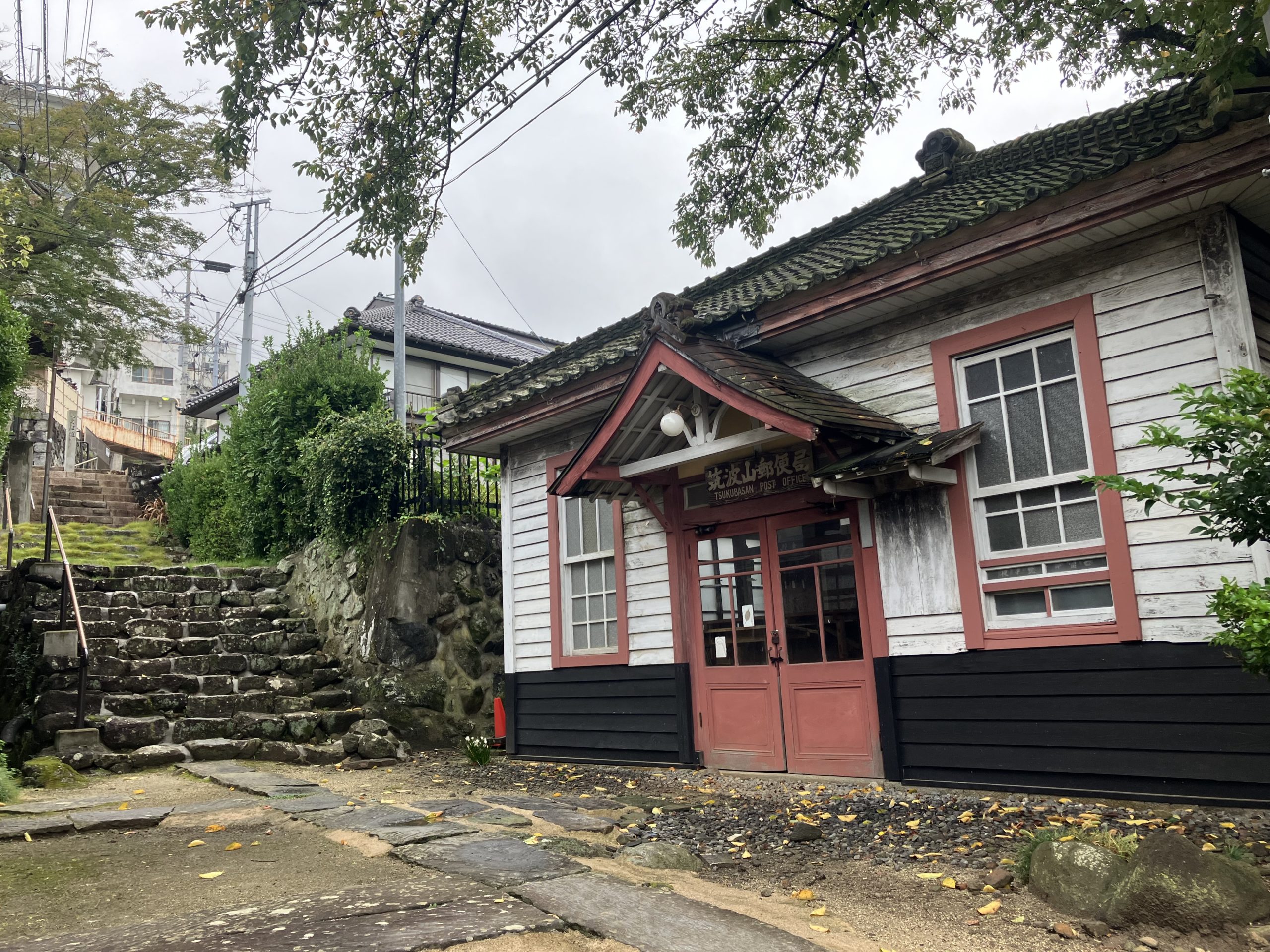 階段の途中には、「旧筑波山郵便局」のレトロな建物が見られます。