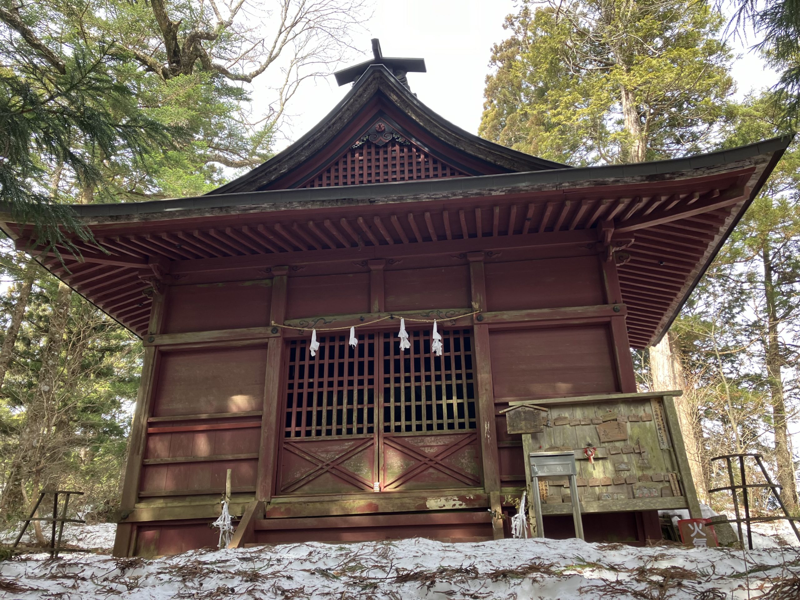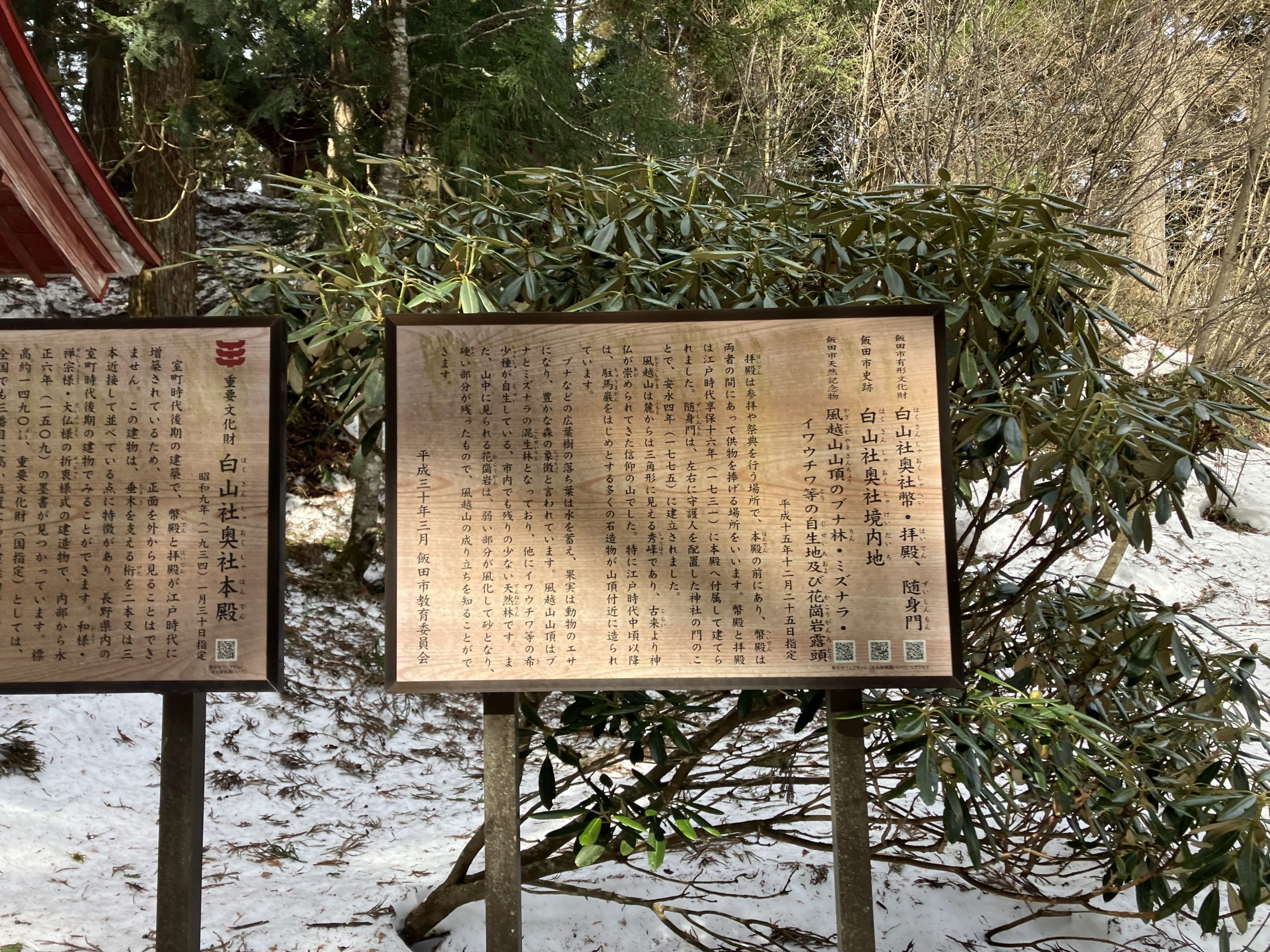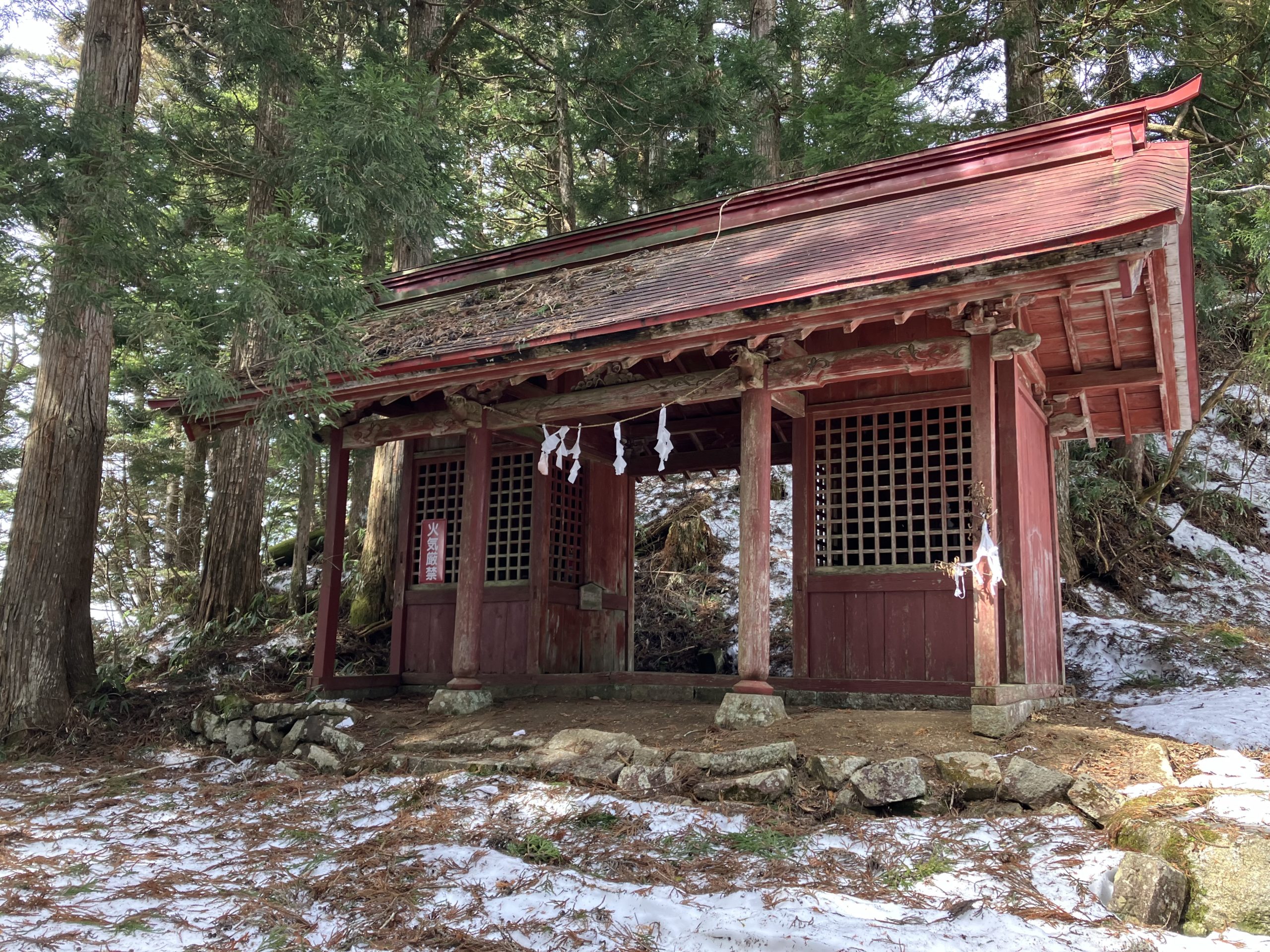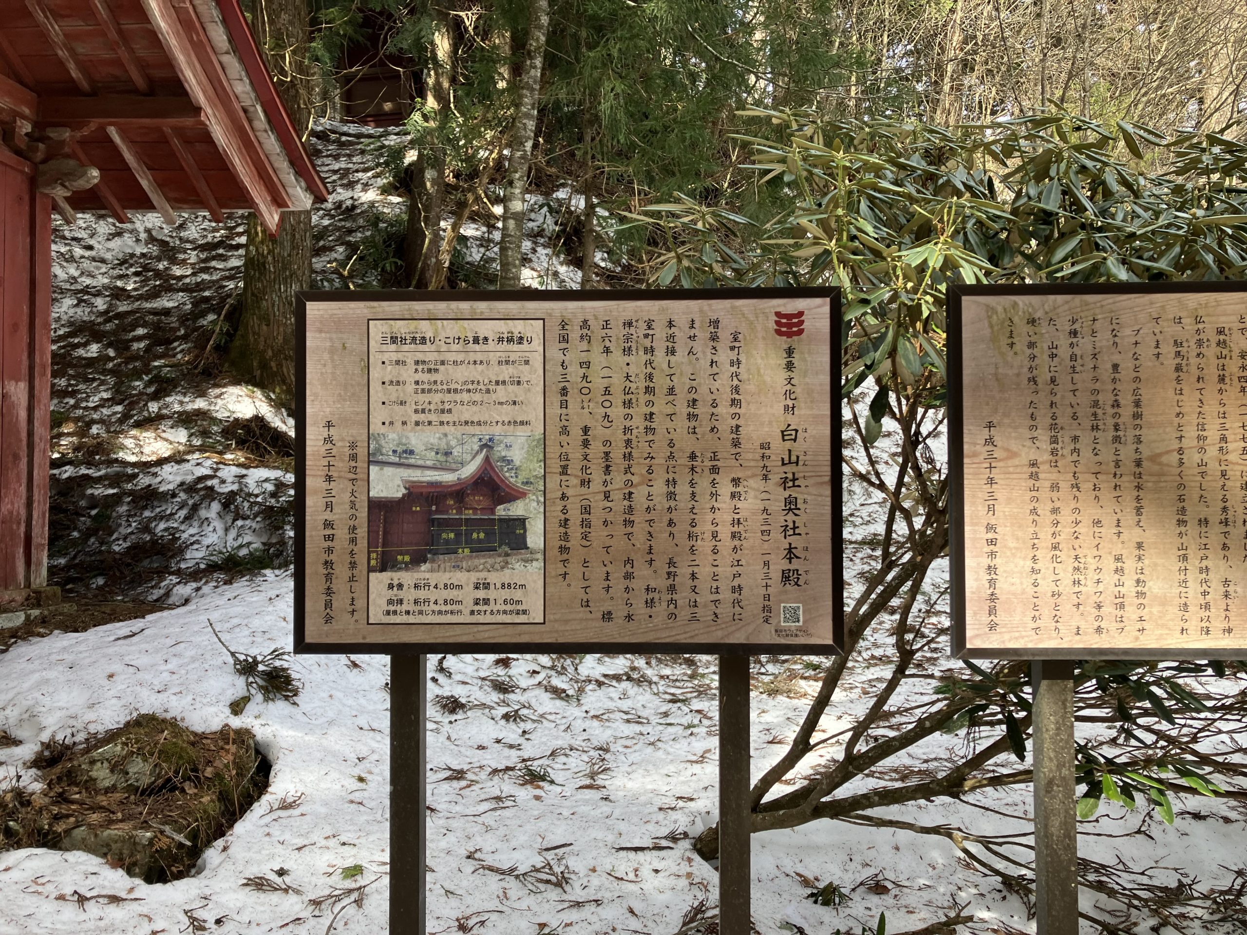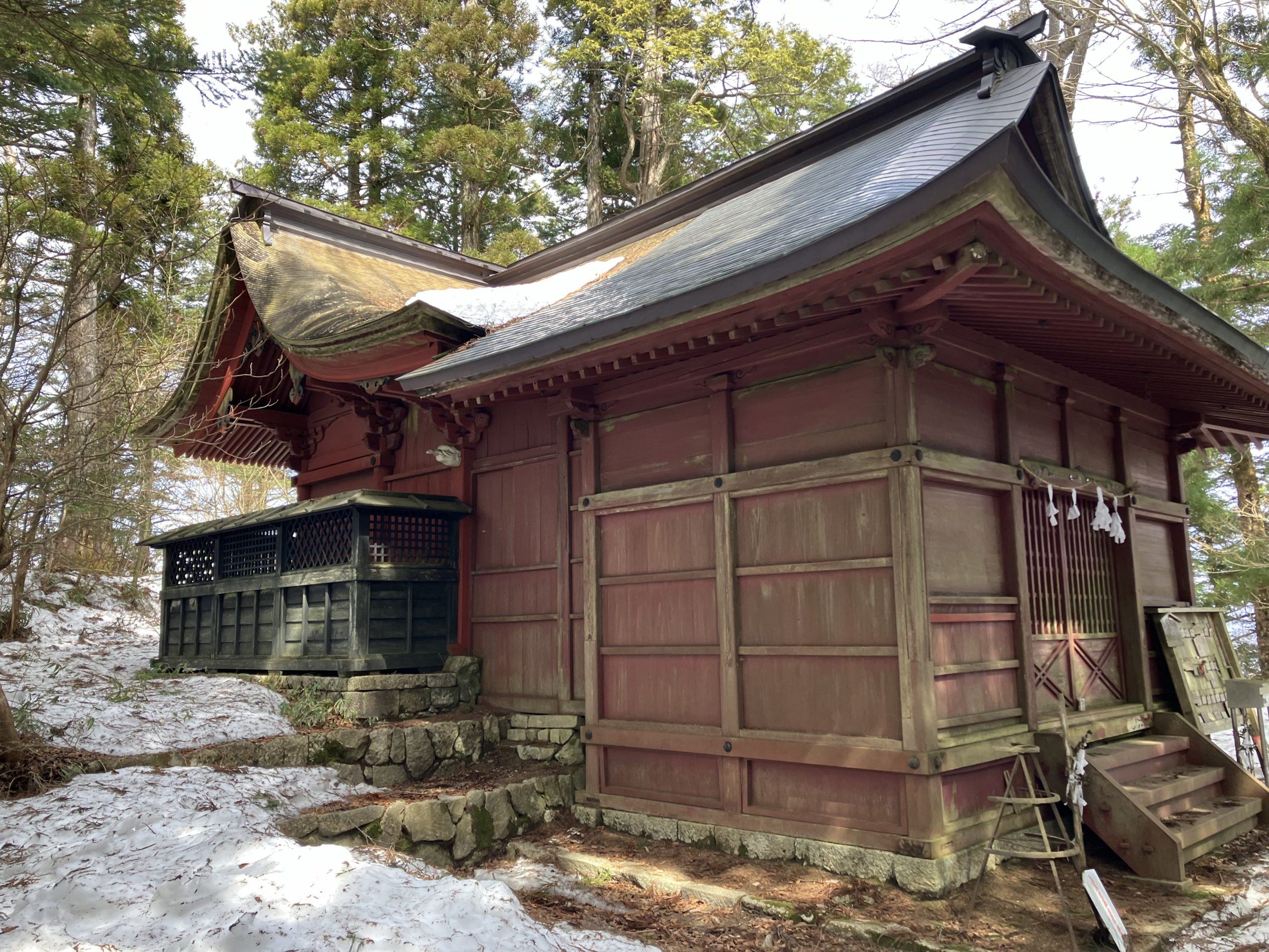 風越山山頂下に鎮座する白山社奥社、日本で3番目に高い場所に建つ重要文化財です。