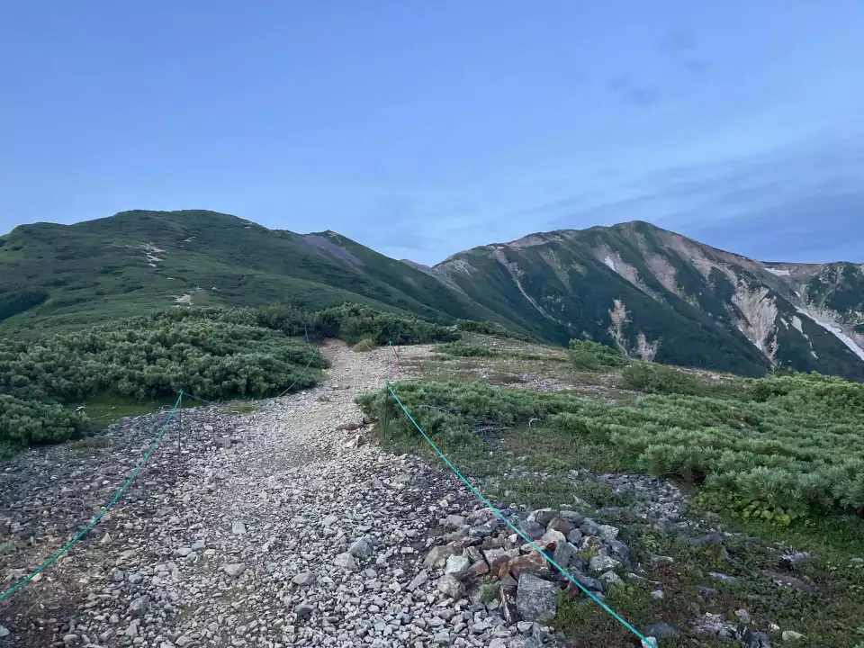 細い登山道、すれ違い時には特に注意が必要です。