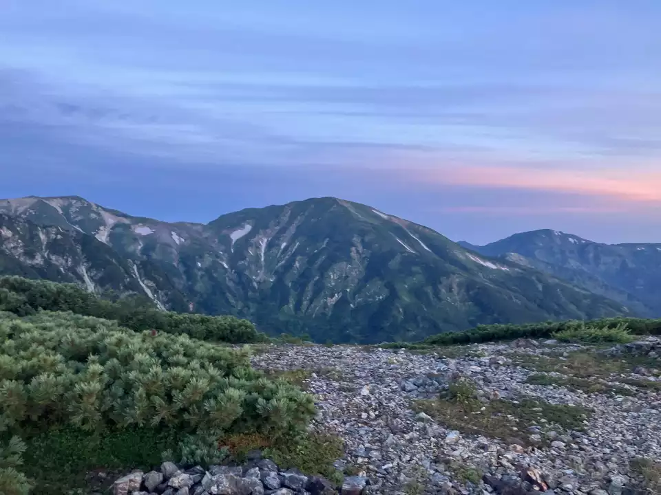 森林限界を越えた所で夜明け、奥に頸城山塊を望みます。