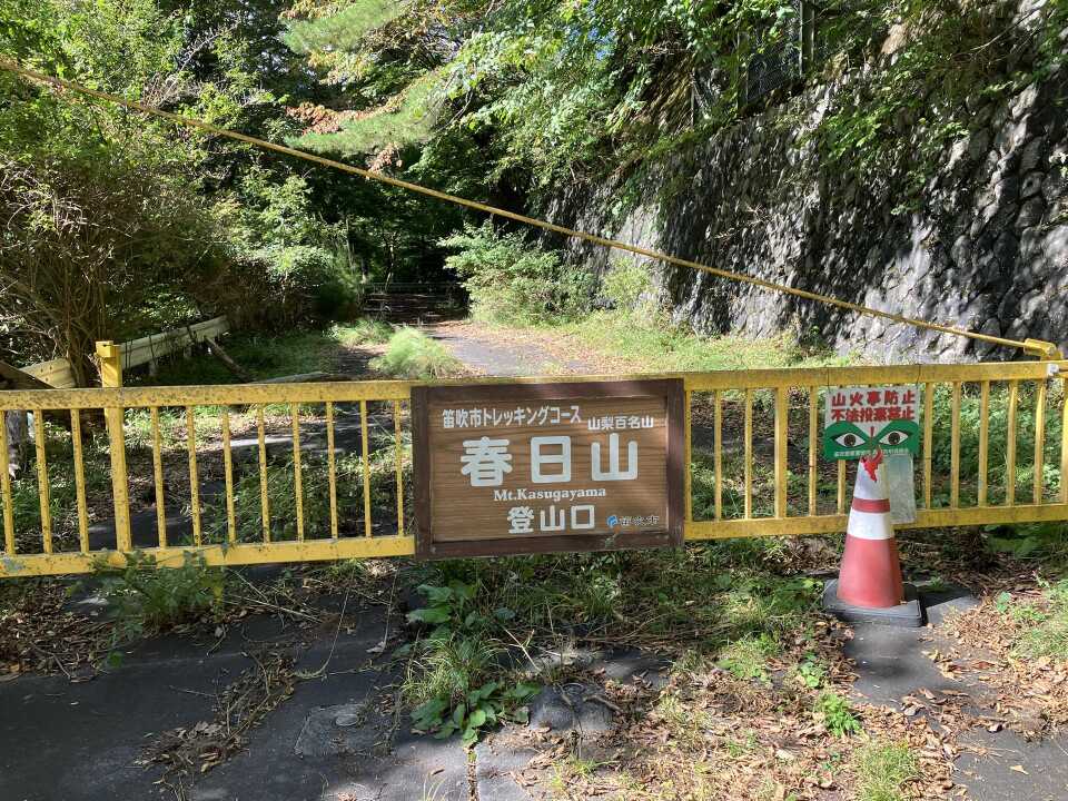 中央自動車道の笛吹八代スマートインターチェンジから「富士河口湖」方面に進み、ウッドストックカントリークラブを目指します。ウッドストックカントリークラブの入口を過ぎて4㎞ほど道なりに進むと新鳥坂トンネルで、トンネルを抜けて右側に登山口(旧道のゲート)があります。ゲートに「春日山登山口」の看板があり、ゲート前に駐車スペースがありますが、特に整備されてはいません。