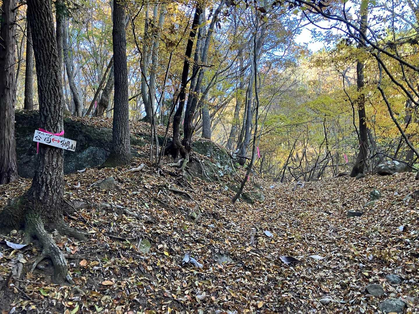 | ほったらかし温泉駐車場(13:04)→山の神コース・重ね石コース分岐(麓側)(13:25)→山神社〈山ノ神コース〉(13:30)→山の神コース・重ね石コース分岐(山頂側)(13:56)→棚山前こぶ(14:10)→重ね石(14:16)→鞍掛石〈重ね石ルート〉(14:24)→ほったらかし温泉駐車場(14:48) 所要時間 1時間44分 累積標高 553m / 547m 距離 7.1km | |