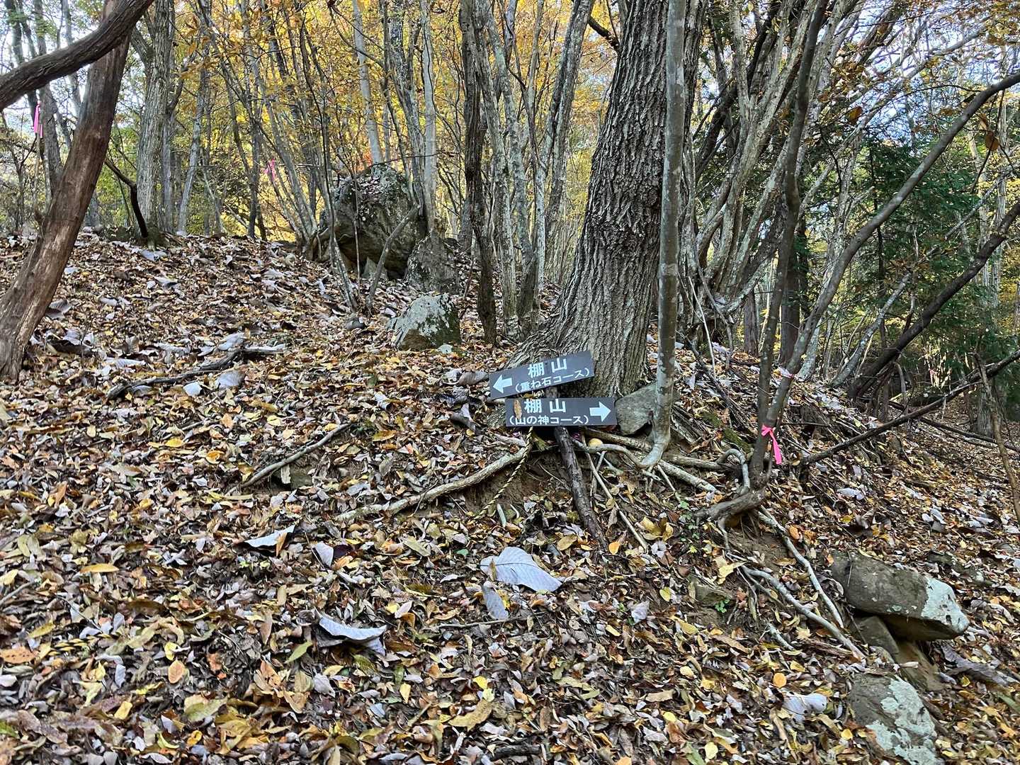 少し歩くと分岐、「左(重ね岩コース)・右(山の神コース)」