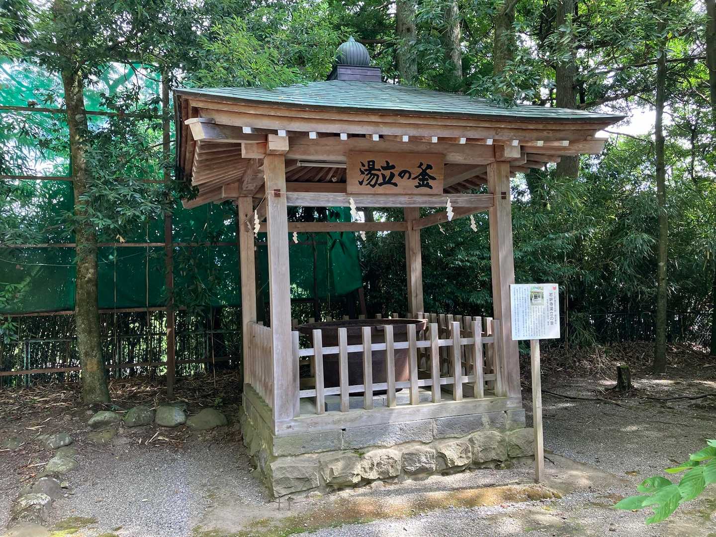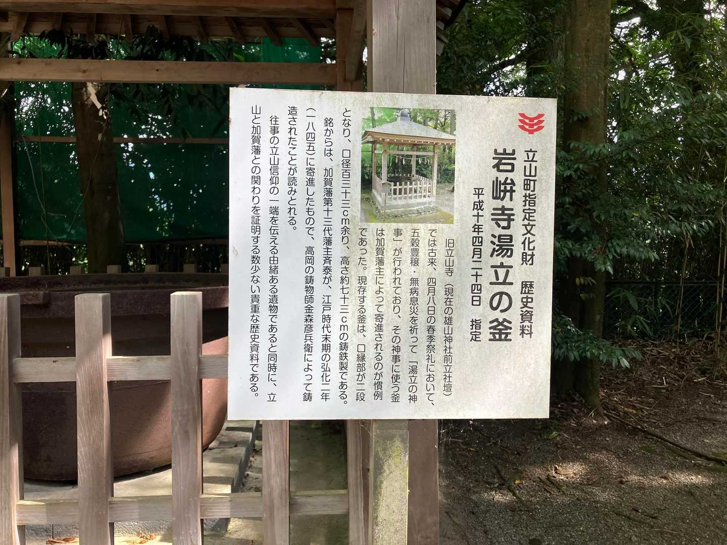 この釜は、弘化2年(1845年)3月に加賀藩12代藩主前田斉泰より寄進された湯立の釜である。昔はお湯を沸かし、お参りした人々が身にふりかけて、罪のないことを神様に誓った。また江戸時代には4月8日の春祭りにこの釜でお湯を沸かし湯茶の接待をしていた。高岡の鋳物師金森彦兵衛によって鋳造され、内側には阿弥陀如来と不動明王を表す梵字が施されている。