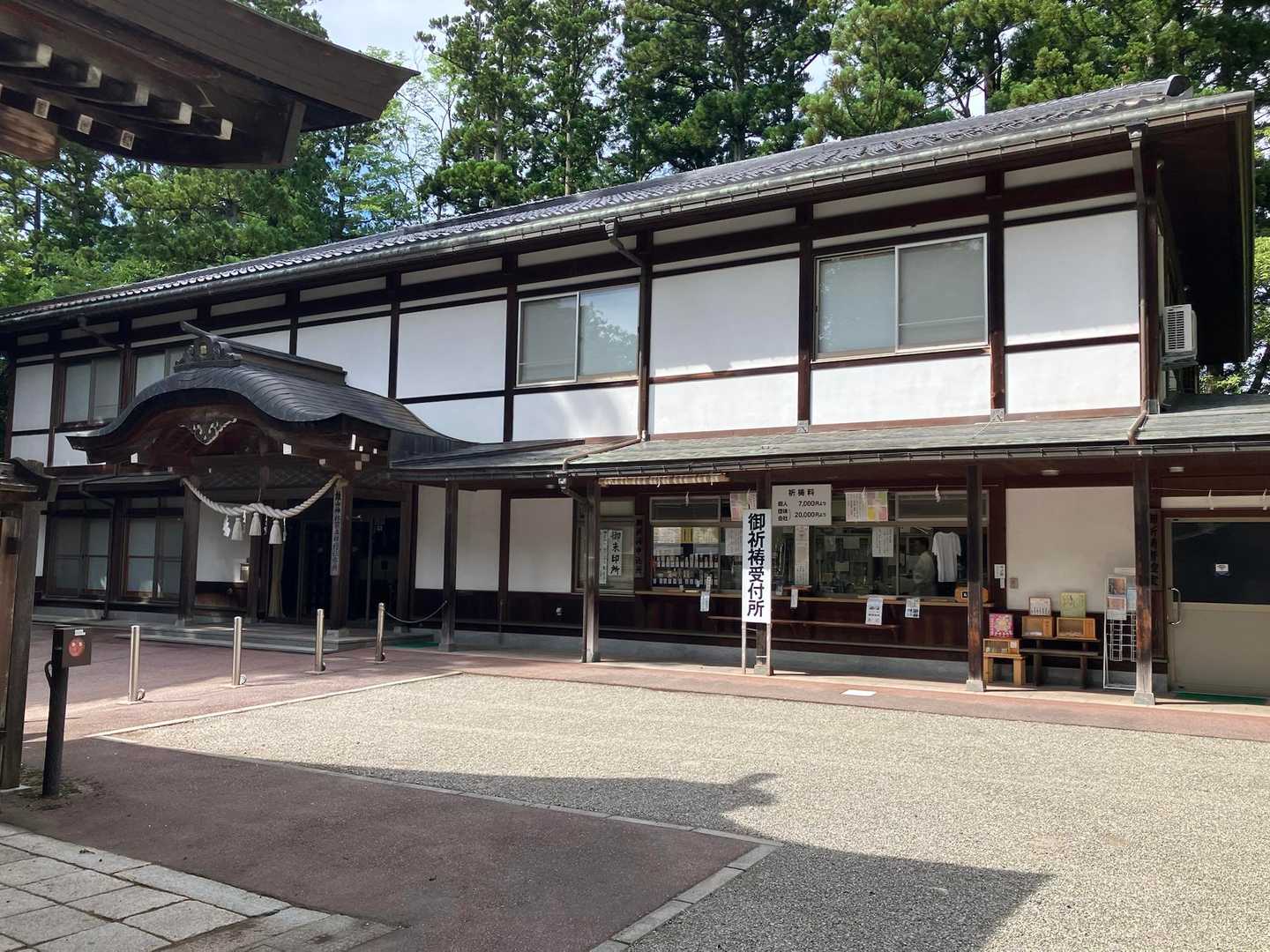 現在の社務所は平成7年(1995年)12月に竣工したもので、二階に100名収容可能な大広間があり、祭典直会、各種行事に使用される。一階窓口では御守・御朱印などの授与、御祈祷受付を行っている。